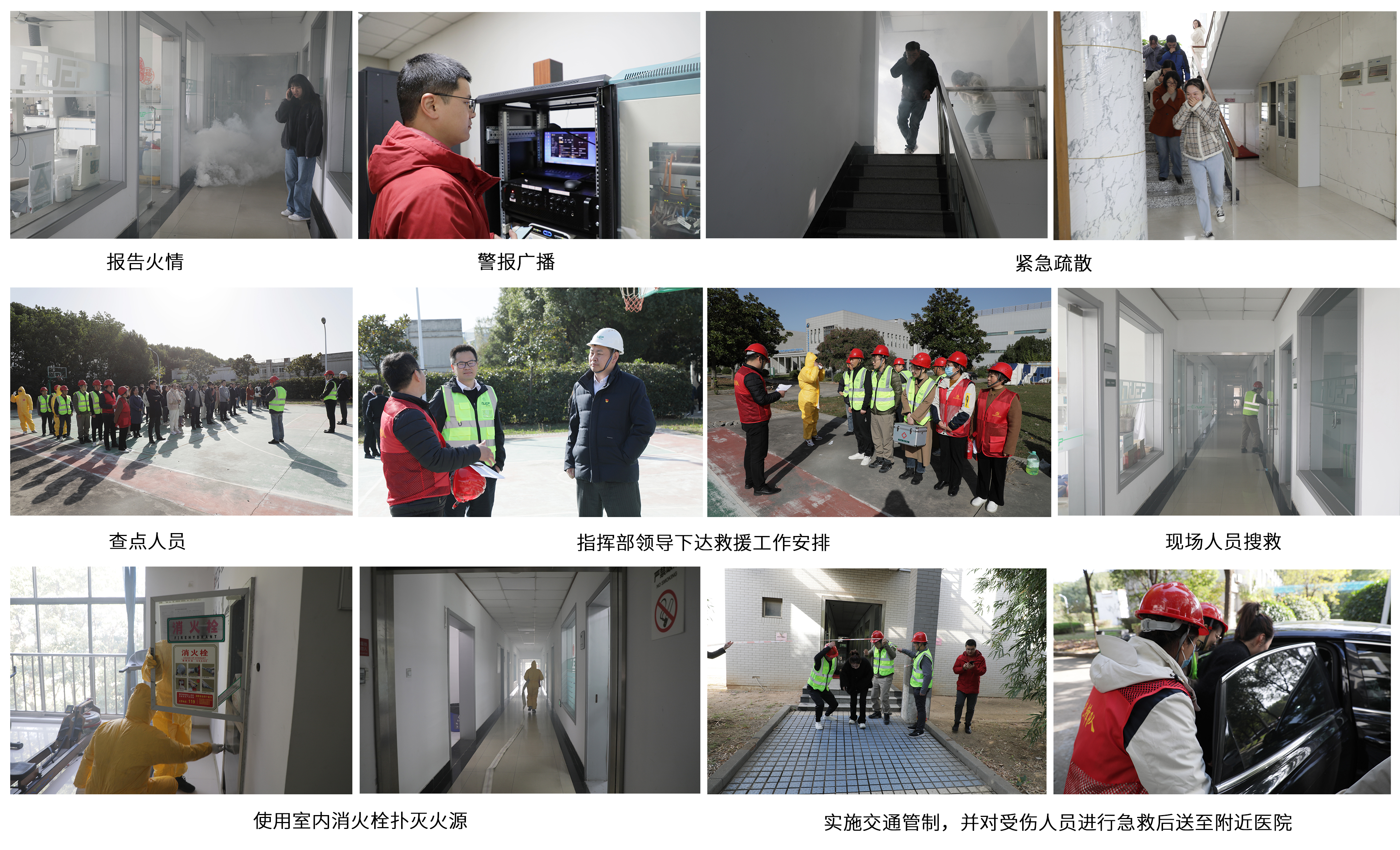 上午9:30分,模擬辦公樓三層實(shí)驗(yàn)室突發(fā)火情,火災(zāi)呈現(xiàn)蔓延趨勢(shì),接到險(xiǎn)情報(bào)告后,指揮部迅速啟動(dòng)應(yīng)急預(yù)案,各應(yīng)急小組從火警廣播、人員疏散、人員救援、火災(zāi)撲救等全流程、全環(huán)節(jié)進(jìn)行“模擬實(shí)戰(zhàn)”。9點(diǎn)32分,各部門人員按照疏散路線、采用合理動(dòng)作有序撤離辦公樓并在指定安全地點(diǎn)集結(jié);9點(diǎn)33分,應(yīng)急隊(duì)伍緊急集合完畢,并進(jìn)入現(xiàn)場(chǎng)開(kāi)展交通警戒、人員搜救和火災(zāi)撲救等行動(dòng);9:45分,現(xiàn)場(chǎng)火勢(shì)撲滅,應(yīng)急隊(duì)伍返回集結(jié)點(diǎn)并向指揮部匯報(bào)應(yīng)急救援結(jié)果。